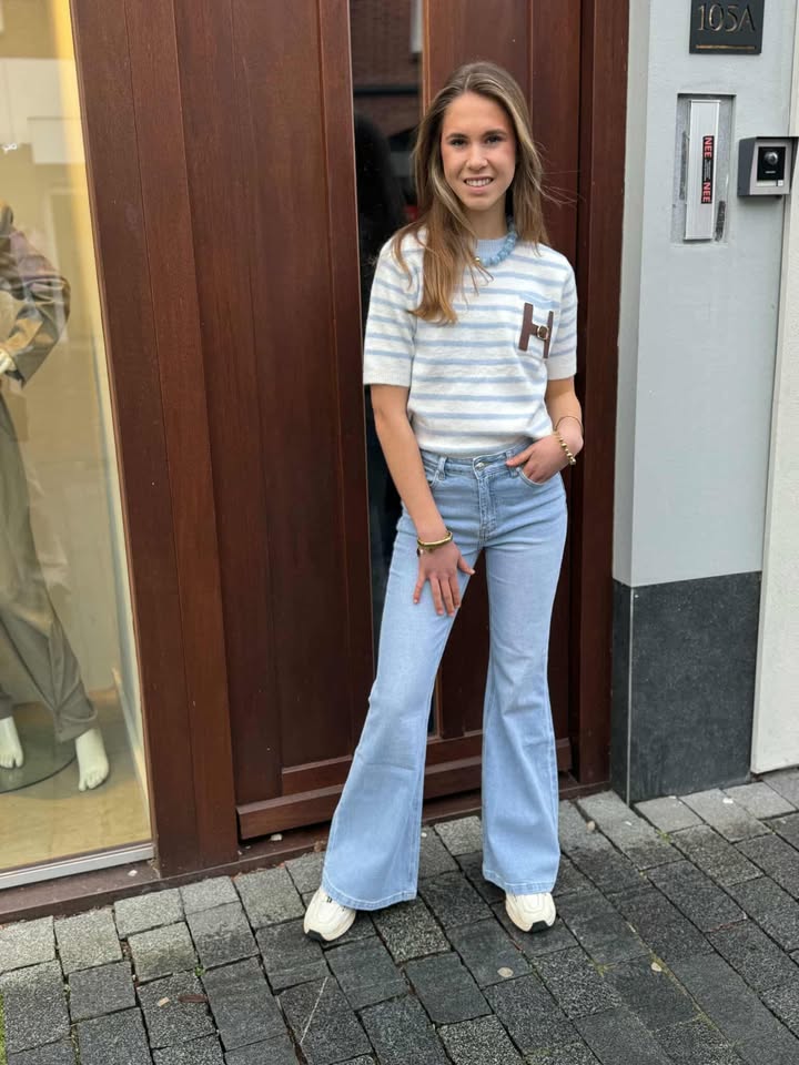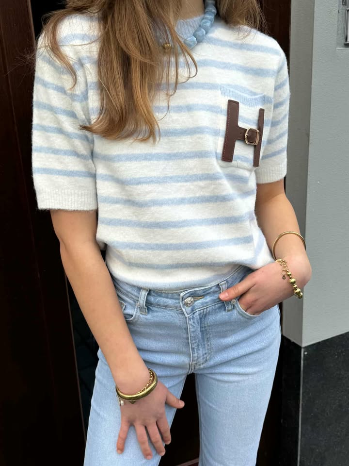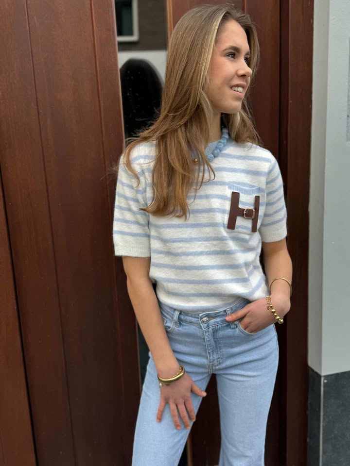 Onze nieuwe Hailey sweater heeft een leuk streep design met details op de borstzak en een korte mouw. Je kunt deze eenvoudig combineren onder een blazer of jas. En natuurlijk ook nog met een kanten top eronder.